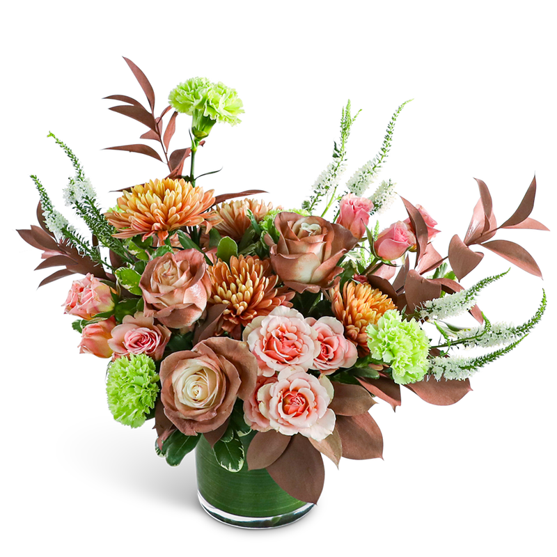 Our Mocha Muse design embodies elegance and sophistication, with Mocha Mousse being an on-trend color palette. Unique roses, Cremons, Veronica, Carnations, and premium foliage blend harmoniously in a leaf-lined glass vase, creating a stunning arrangement that captivates with its warm and alluring tones. Embrace the trend and elevate your space with a touch of modern charm with our Mocha Muse design today. As a trusted local florist, we take pride in every order, offering hand-crafted flower designs delivered directly to the recipient. Our flower shop is committed to providing the highest quality, freshest flowers, and ensuring timely delivery for every arrangement.