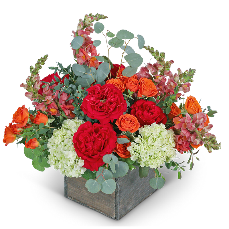 The warm glow of sunset is captured in this stunning arrangement. Moroccan Sunset features roses, hydrangeas, snapdragons, and assorted foliage in a charming wooden box. Whether celebrating a birthday, a new baby, or retirement, this bouquet will add just the right touch of warmth to your celebration.'What a great way to bring a touch of happiness into the home or office.