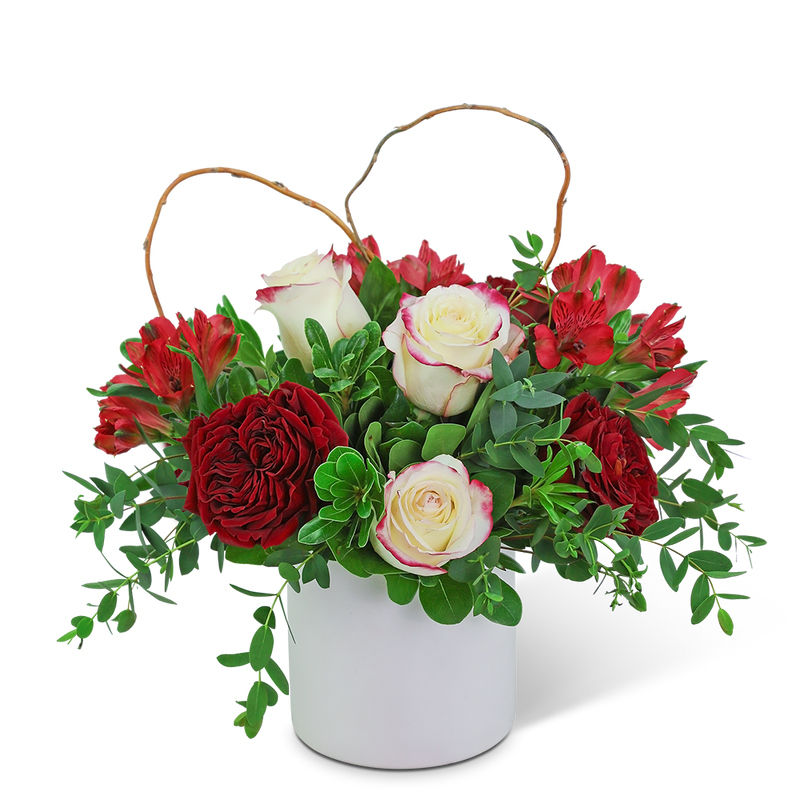 This gorgeous design is hand-arranged by our professional floral designers and delivered in an on-trend white vase. The rich, romantic colors of My Romance are sure to melt the heart of your loved one. Beautiful ruffly roses, alstroemeria, and premium foliage are artfully arranged with a natural heart accent nestled in. Flower delivery has never been easier or more appreciated. Whether you are looking for a birthday, anniversary, or valentines day gift, we have flowers that are sure to fit the occasion!