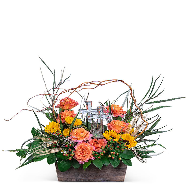 Never Walk Alone is a beautiful gift for any occasion. This gorgeous design features orange roses, bright sunflowers, hypericum berry, and curly willow, all artfully surrounding a keepsake crystal cross. Sunflowers represent pure love and adoration and will bring happiness to any day.
