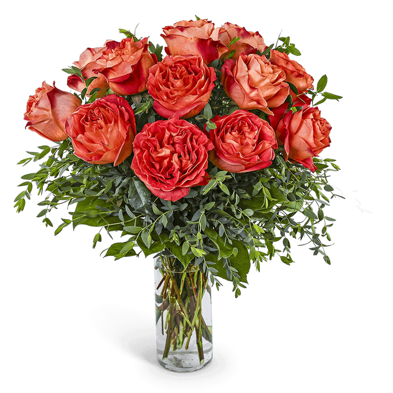 One Dozen Wild Spirit Roses in a clear glass vase features bold, sunset-toned blooms that radiate warmth and energy. Perfect for birthdays, celebrations, or to brighten someone's day. This vibrant arrangement is full of color, personality, and heartfelt sentiment.