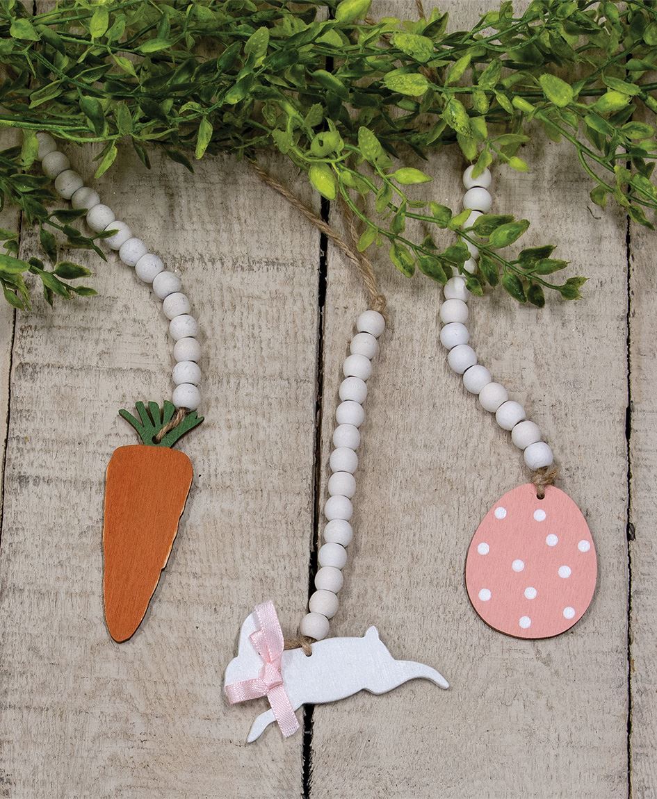 Spread some Easter vibes around the farmhouse with the Pastel Beaded Bunny, Easter Egg, or Carrot Ornament assortment. These wooden ornaments feature white beaded hangers made of jute and range from 9" to 12" in total length. One features a white jumping rabbit with a pink bow around its neck. It measures 1.75" high by 2.75" wide. Another is an orange carrot with a green top and measures 3.5" high by 1.25" wide. The third ornament features an egg shape in pink with white polka dots. It measures 2.5" high by 1.75" wide. These ornaments will add a little charm to a Spring wreath or garland or look adorable tucked into trays or Easter baskets.