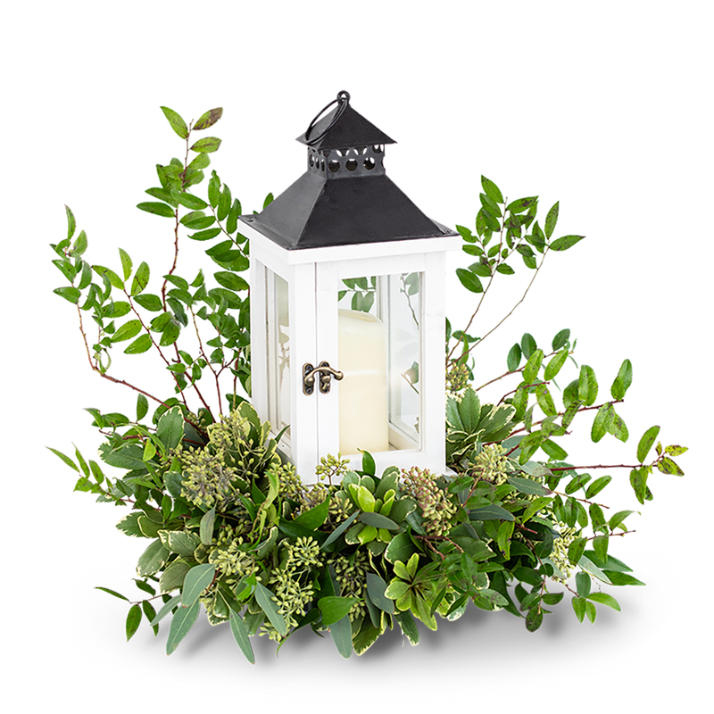 A lantern is a great keepsake for the home, but is also a comforting symbol of lighting the path ahead. Peaceful Light is a customer and shop favorite, as a sympathy gift, or just because. A beautiful white lantern surrounded by premium foliage creates a peaceful atmosphere and serves as a beautiful keepsake for years to come. This design will look perfect in the middle of a dining or coffee table, and will be a treasure to the recipient.