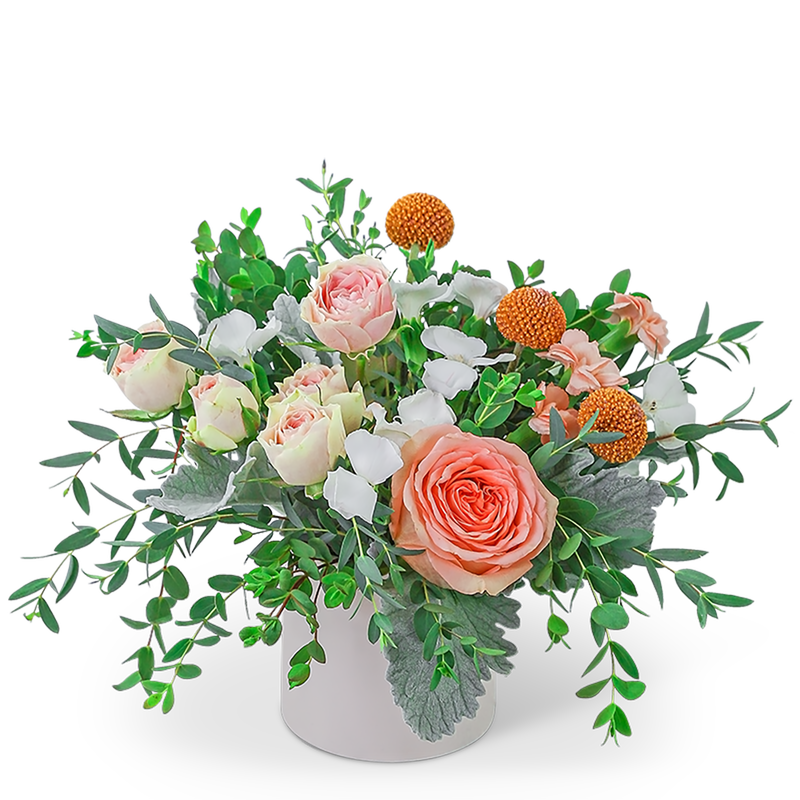 Who wouldn't love this sweet arrangement of peaches and creams? Peach Blossom contains roses, carnations, Crespedia, all accented with a variety of foliage. Whether for a birthday, new baby, or get well gift, this will look perfect on a side table or desk!