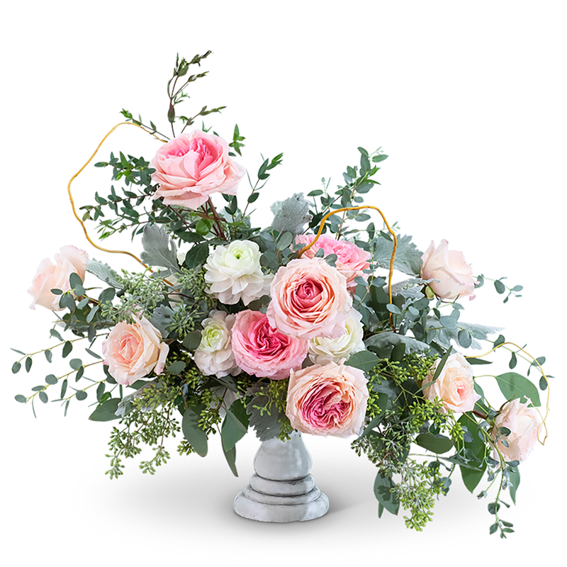 This stylized free-form and asymmetrical design creates a whimsical, romantic look. Pink Chiffon Compote features pink and coral Myra roses with soft pink ranunculus, accented with dusty miller and different varieties of eucalyptus and premium foliage. This Compote floral arrangement would make the perfect anniversary gift or centerpiece for a romantic occasion or event.