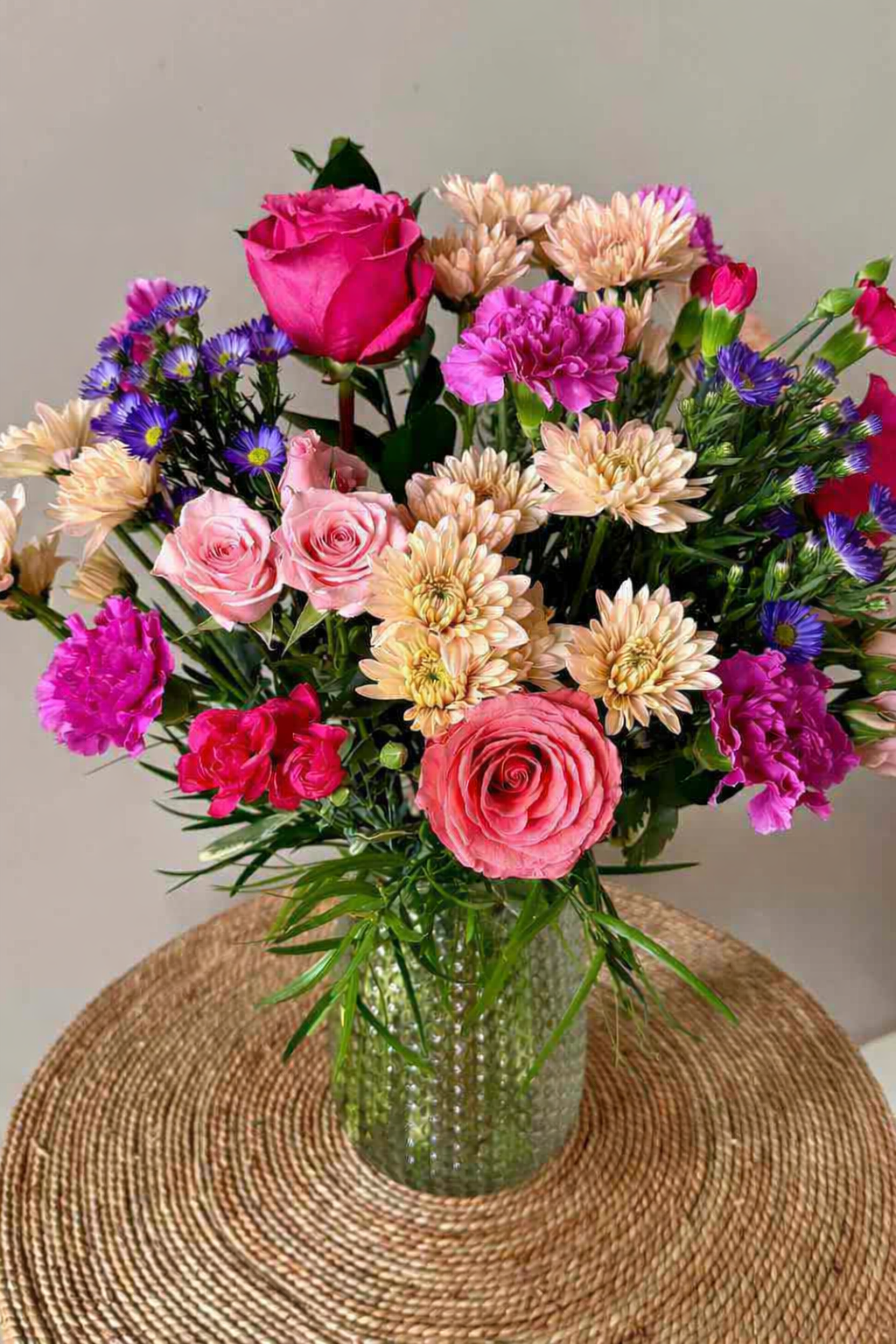 A colorful vase is filled with peach daisies, pink and purple carnations, monte casino, and roses... Upgrade, and we will add more flowers, and larger vessel, because bigger is always better!