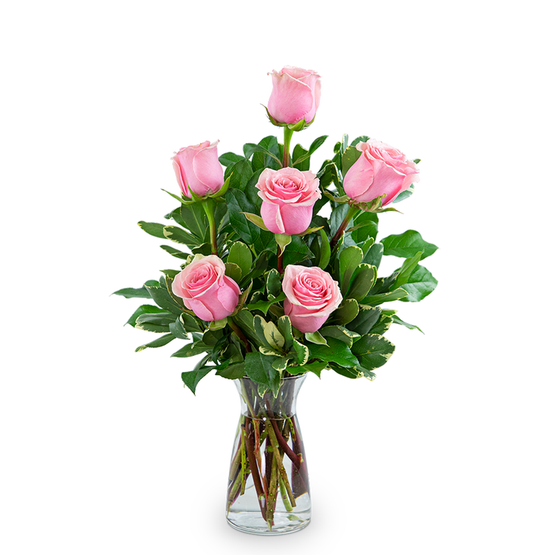 Everyone is crazy about our pink roses! Pink roses symbolize femininity, elegance, grace, and sweetness. Send pink roses to celebrate a special occasion, convey gratitude, or to say thank you. This half dozen pink rose arrangement, along with the perfect greens, will be sure to make someone's day very special.