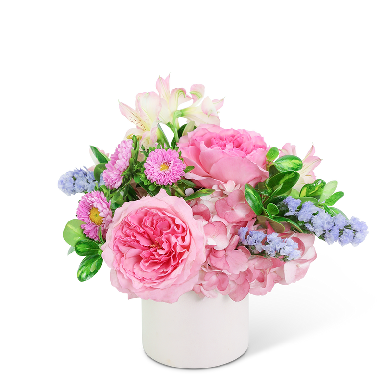 Send your love with this beautiful design, perfect for a birthday, new baby, or anniversary gift. Pinky Sweet features pink roses, Alstroemeria, and Hydrangea designed in a white cylinder for a delicate look that will make anyone smile. This unique flower design adds the perfect extra pop of pastel color! We can offer same-day flower delivery in most cases. If you are sending the bouquet directly to your recipient, please provide the complete address and contact information so that we can deliver the flowers directly to them.