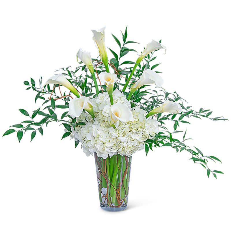 Porcelain Dream is a gorgeous design with Calla Lilies, Hydrangea, Curly Willow, Italian Ruscus, and other premium foliage. The Calla has a trumpet-shaped bloom and is a symbol of change, growth, and wisdom. These classic white flowers are perfect for an anniversary gift or even sympathy flowers to send to the service or the home.