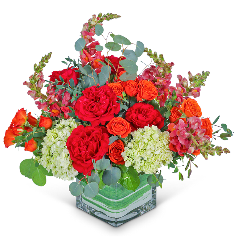 The warm glow of sunset is captured in this stunning arrangement. Positano Paradise features roses, hydrangeas, snapdragons, and assorted foliage in a leaf-lined vase. Whether celebrating a birthday, a new baby, or retirement, this bouquet will add just the right touch of warmth to your celebration.'What a great way to bring a touch of happiness into the home or office.