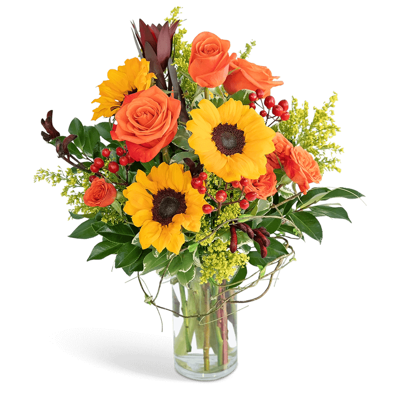 Bring a little Italy into someone's world with our Postcard from Tuscany arrangement, featuring fresh Roses, Sunflowers, Hypericum Berries, Leucodendron, and premium foliage. This beautiful bouquet is sure to put a smile on anyone's face and is the perfect gift for a birthday, get-well gift, or to simply celebrate the beauty of fall. All the colors of fall are captured in Postcard from Tuscany and will add just the right touch of warmth to any home. This burst of colorful flowers is designed by our florist in a clear glass vase to create a gift that will truly shine.