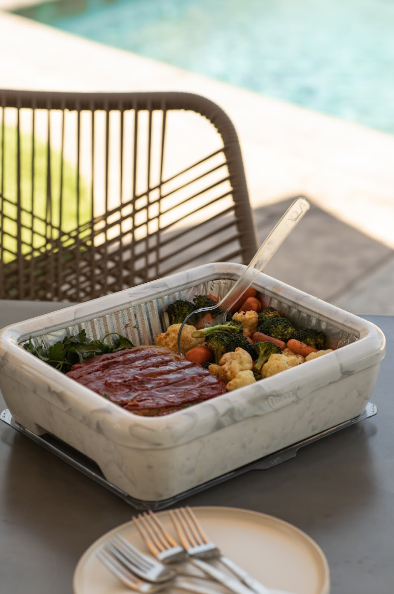Open the frame, place your filled foil pan inside, and snap on the clear lid. Works with hot or cold food, straight from the oven or fridge.