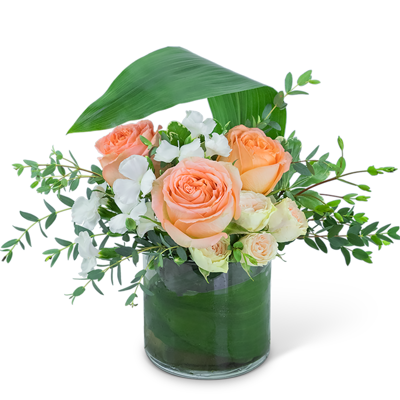 This modern arrangement of peaches and creams will add a pop to any space! Prosecco Pop contains roses, carnations, and premium foliage accented with sheltering Aspidistra Leaves. It will sparkle on any desk or coffee table.