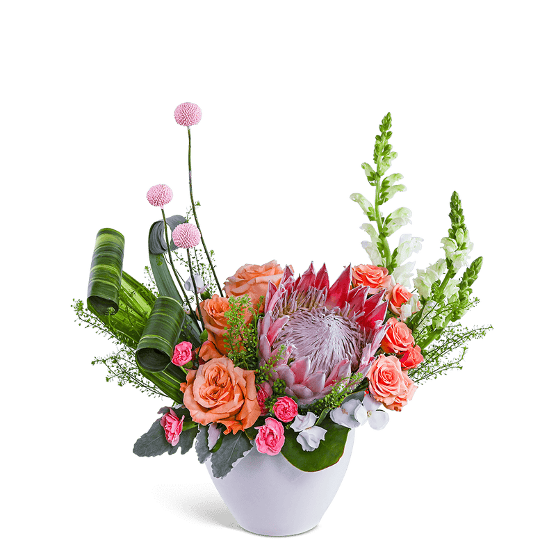 Prosecco Sunrise is a fresh and contemporary mix of King Protea, Roses, Snapdragons, and playful accents arranged in a modern white ceramic bowl. This high-end design makes a striking centerpiece for events, special occasions, or a memorable flower delivery. Our floral designer may make thoughtful substitutions while maintaining the overall look of the arrangement.