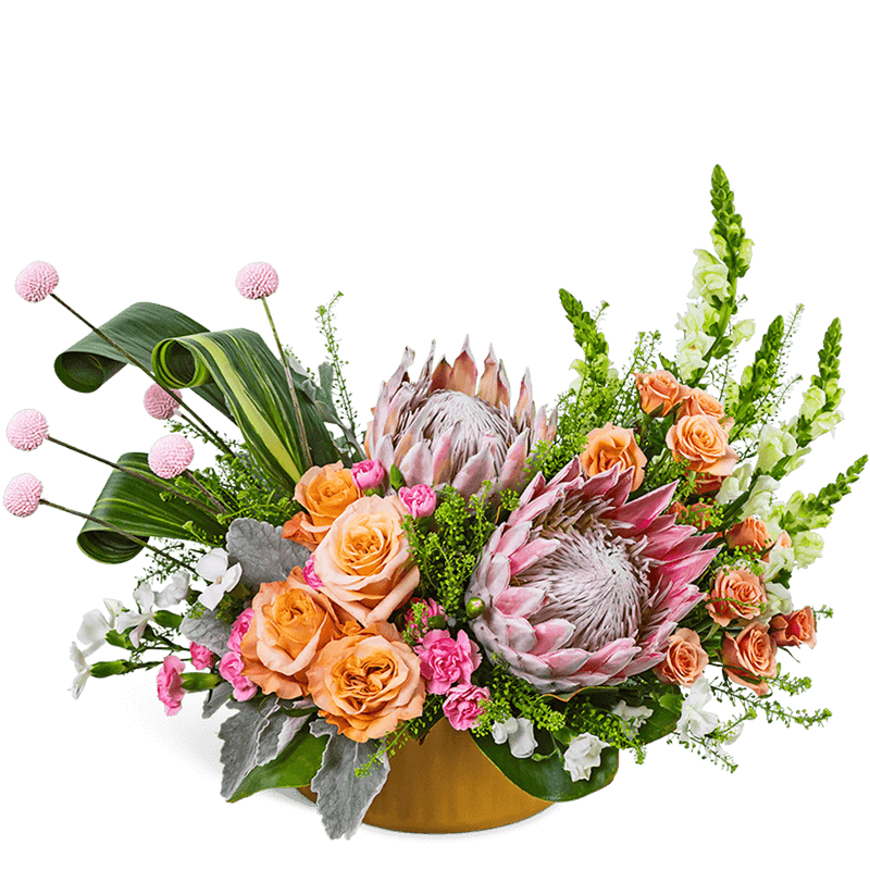 Prosecco Sunset is a striking arrangement that blends King Protea, Roses, Snapdragons, and playful accents with lush greenery in a ceramic bowl. This luxurious floral piece makes the perfect centerpiece for special events, upscale gatherings, or as a stunning flower delivery for birthdays or celebrations. Our floral designer may make thoughtful substitutions while maintaining the overall look of the arrangement.