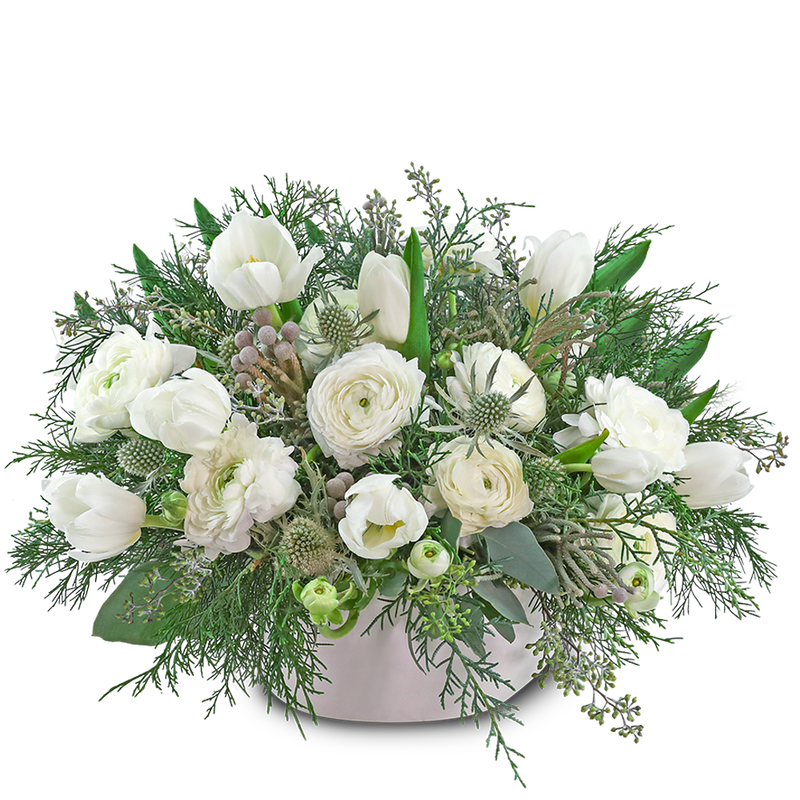 Indulge in Pure Winter Bliss with this elegant floral design featuring white Tulips and Ranunculus accented by premium foliage, all artfully arranged in a beautiful white bowl. Perfect for adding a touch of serenity and sophistication to any winter occasion, this arrangement evokes a sense of purity and charm that will enchant any recipient.