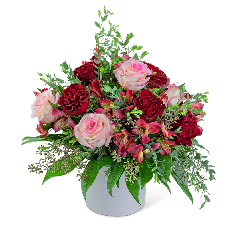 The warm tones of this arrangement are as rich as its namesake. Red Velvet Crush contains roses and alstroemeria, surrounded by a variety of premium foliage. This large bouquet will look perfect on an entry or dining table.