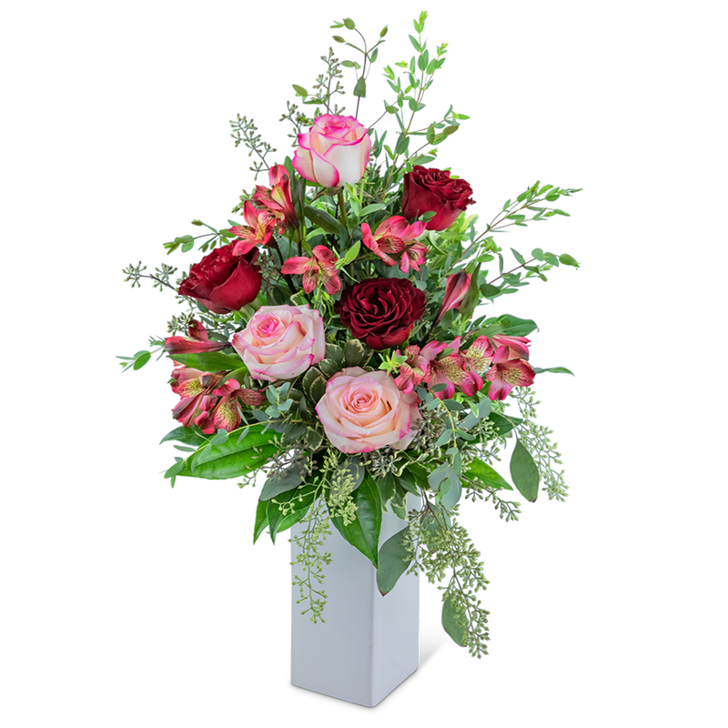 Send your heartfelt emotions to a loved one with this stunning arrangement. Roses and alstroemeria, surrounded by a variety of premium foliage including seeded eucalyptus and displayed in a tall white vase. Red Velvet Heart is the perfect piece for an entry or dining table.