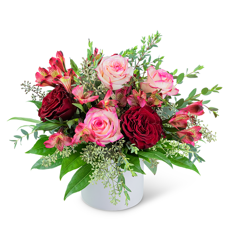 The warm tones of this arrangement are as rich as its namesake. Red Velvet Love contains roses and alstroemeria, surrounded by a variety of premium foliage. It will look perfect on any entry or coffee table.