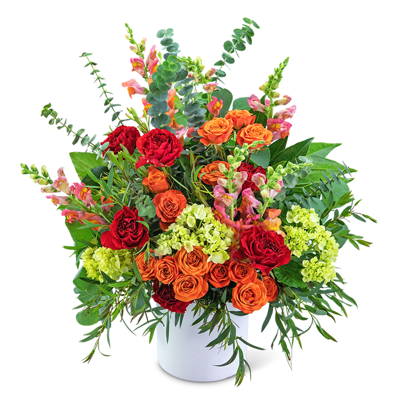 Rio Grande lives up to its name! This large bouquet of roses, snapdragons, hydrangea, eucalyptus, and parvifolia is presented in a modern white container. The deep reds, oranges, and pinks of this arrangement will make quite an impression on any entryway or dining room table.