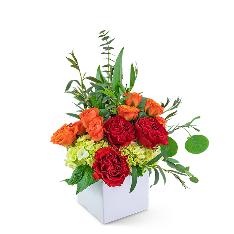 Rio Heat is hot, hot, hot! Roses, hydrangea, eucalyptus, and parvifolia are combined in a modern white container. These deep red and orange blooms will give the perfect pop of color to a side table or desk.