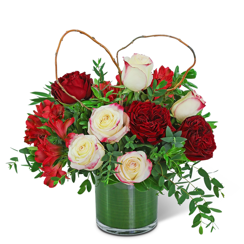 This gorgeous design is hand-arranged by our professional floral designers and delivered in a lovely leaf-lined vase. The rich, romantic colors of Romance in the Air are sure to melt the heart of your loved one. Beautiful ruffly roses, alstroemeria, and premium foliage are artfully arranged with a natural heart accent nestled in. Flower delivery has never been easier or more appreciated. Whether you are looking for a birthday, anniversary, or valentines day gift, we have flowers that are sure to fit the occasion!