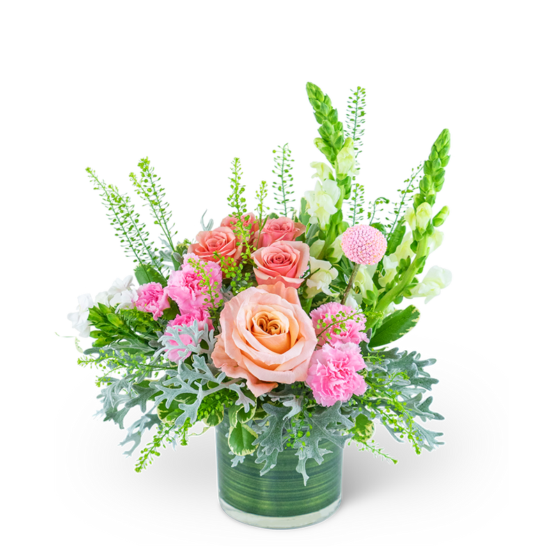 Capture the essence of romance with Rosy Coral Romance, an enchanting flower design that brings together the delicate colors of pink and peach. This elegant arrangement features a stunning mix of Roses, Carnations, Solomio, Craspedia, Snapdragons, and premium foliage that complement each other perfectly. Presented in a leaf-lined cylinder vase, Rosy Coral Romance is guaranteed to delight any recipient and add a touch of warmth and beauty to any space.