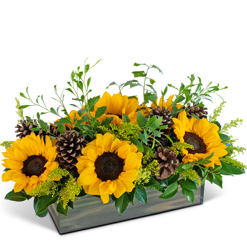 Inspired by the beauty of the harvest season, our Rustic Fields in Autumn design features a captivating blend of sunflowers, rustic pine cones, and lush foliage styled in a long and low wooden cube container. This charming centerpiece infuses the warmth and rustic charm of fall into any setting, making it the perfect choice to adorn your table or send as a heartfelt gift to a loved one. Upgrade to deluxe or premium for more blooms, enhancing the beauty of this stunning arrangement.