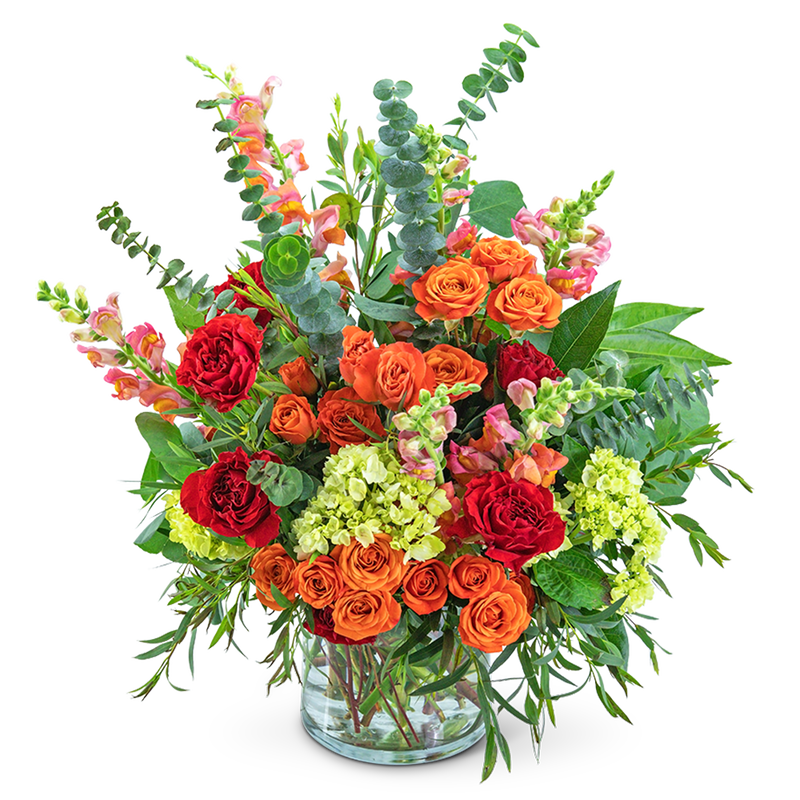 With its deep reds, oranges, and pinks, this arrangement is as stunning as it's namesake. Santorini Sunset features roses, snapdragons, hydrangea, pittosporum, eucalyptus, and parvifolia. This bouquet will add just the right touch of warmth to any entryway or dining room table.