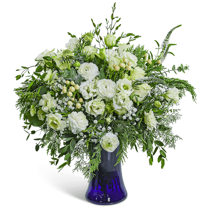 Sapphire Glacier is a lush all-white arrangement featuring Lisianthus, Ranunculus, Veronica, Hypericum Berries, and winter foliage in a striking cobalt blue vase. Its full, textured design brings elegance and serenity to any space. Flowers and vase may vary slightly based on availability, with thoughtful substitutions made by our floral designer to maintain the overall look and feel.