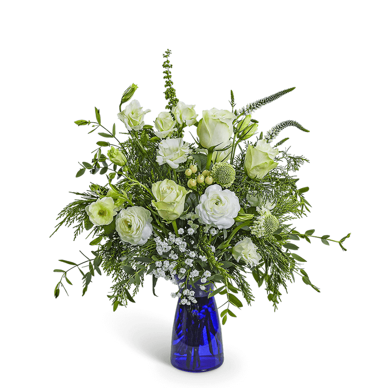Sapphire Snow is a fresh and graceful white arrangement featuring Roses, Ranunculus, Veronica, Hypericum Berries, Baby's Breath, and winter foliage in a cobalt blue vase. Its light and airy design is perfect for celebrating the season or sending a thoughtful gesture. Flowers and vase may vary slightly based on availability, with thoughtful substitutions made by our floral designer to maintain the overall look and feel.