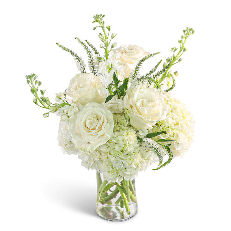 Our Simply Pure design features an elegant white color palette, with White Hydrangea, Roses, Veronica, Stock, and premium foliage. This timeless arrangement exudes a sense of tranquility and sophistication, perfect for any occasion. Its serene beauty makes it a perfect choice for adding a touch of purity and grace to any space. As a trusted local florist, we take pride in every order, offering hand-crafted flower designs delivered directly to the recipient. Our flower shop is committed to providing the highest quality, freshest flowers, and ensuring timely delivery for every arrangement.