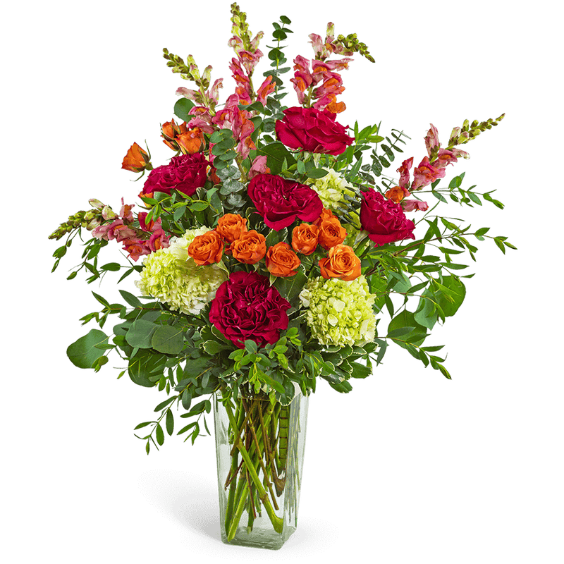 Sorrento Flora is a vibrant mix of Roses, Snapdragons, Hydrangea, and lush foliage. Designed in a clear glass vase, it's a stunning choice for anniversaries, birthdays, or just because flower delivery. Our local florist may make thoughtful substitutions to ensure the freshest blooms while keeping the overall charm of the design.
