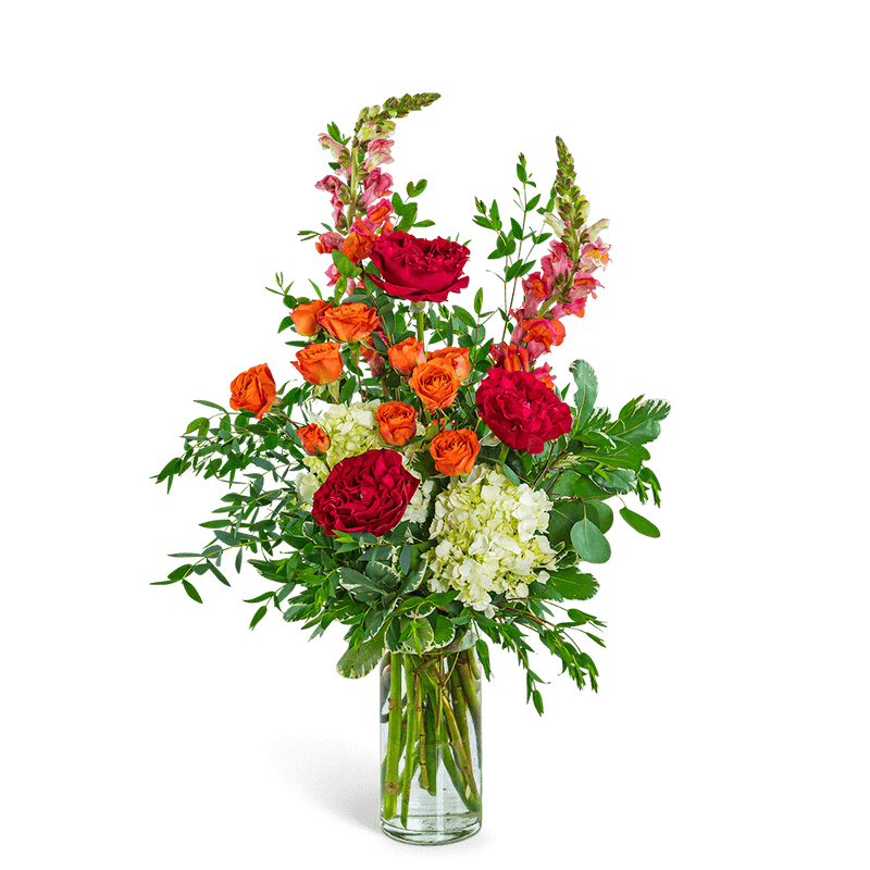 Sorrento Love is a vibrant mix of Roses, Snapdragons, Hydrangea, and lush foliage. Designed in a clear glass vase, it's a stunning choice for anniversaries, birthdays, or just because flower delivery. Our local florist may make thoughtful substitutions to ensure the freshest blooms while keeping the overall charm of the design.