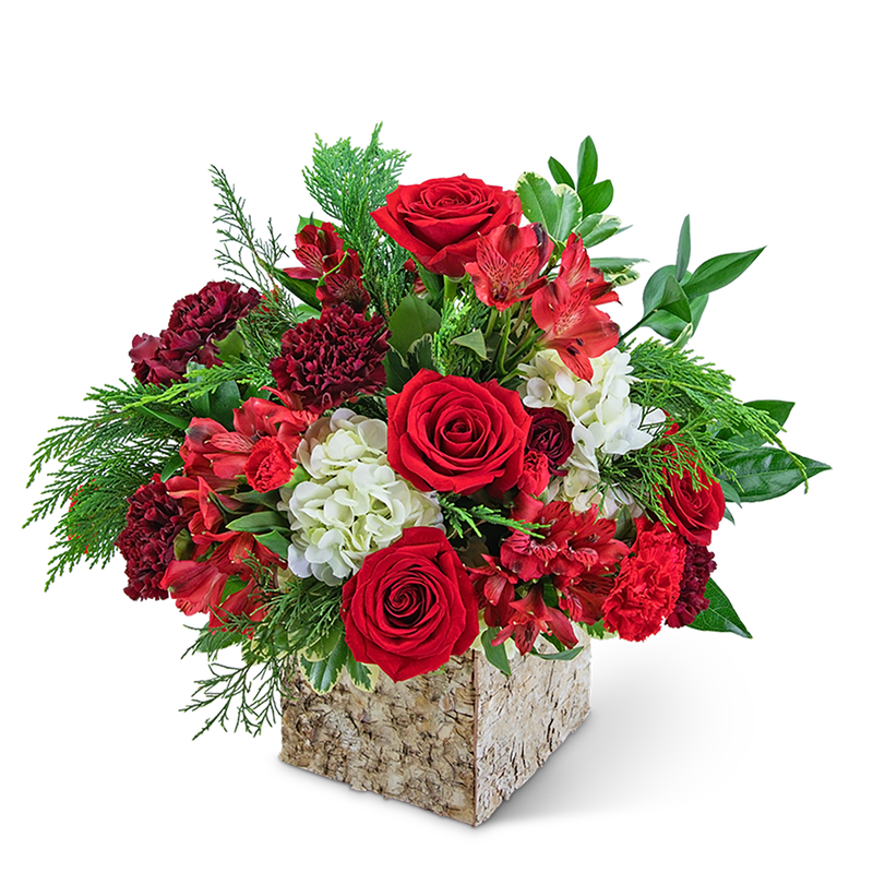 Put a little spice in someone's life with this cheery bouquet! Spiced Apple features roses, hydrangeas, alstroemeria, and carnations accented with a variety of foliage in a charming birch box. This will add just the right touch of color to an entry or dining room table.