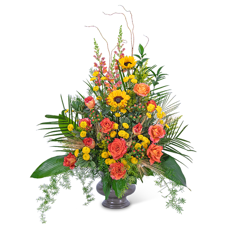The Sunset Reflections Urn is brilliant and beautiful, featuring orange roses, snapdragons, hypericum berry, bright sunflowers, solidago, curly willow, and premium foliage. Sunflowers represent pure love and adoration, which makes this floral design the perfect accent to a funeral or celebration of life ceremony. The Sunset Reflections Urn is a radiant way to celebrate and reflect on an amazing life.