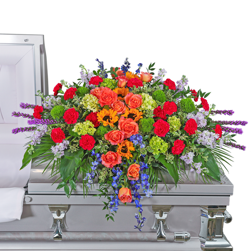 Sympathy flowers are a meaningful way to celebrate the life of the deceased, and forever treasure the memories you made together. Our Treasured Memories Casket Spray features Free Spirit roses, sunflowers, bright pink carnations, liatris, stock, green hydrangea, solidago, curly willow, and premium foliage. Funeral flowers bring healing in many ways, they serve as a memorial to honor the one that we lost, all while providing comfort to the friends and family left behind.