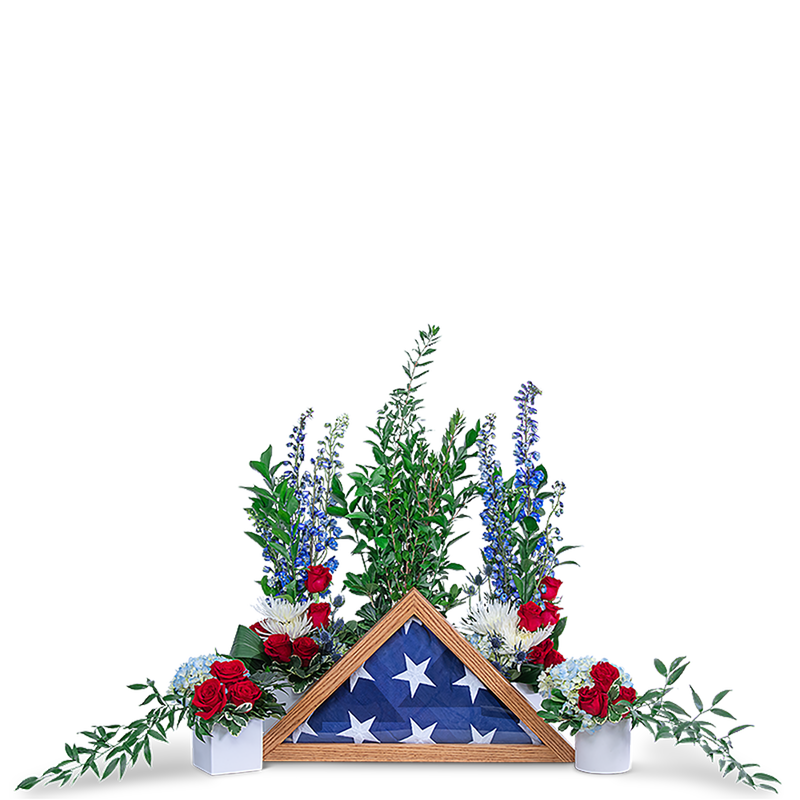 Our Valiant Tribute design is a popular choice for the funeral or celebration of life ceremony for the patriot you are honoring. Sympathy flowers for a veteran are beautifully shown in red, white, and blue funeral flowers. This patriotic theme is beautifully accomplished with five individual designs featuring a combination of Roses, Hydrangea, Spider Mums, Delphinium, Ruscus, Aspidistra, and other premium foliage. They come together to make a truly valiant tribute for your loved one. The flag is not included but is featured to show the unique personalization of adding a family keepsake to the design.