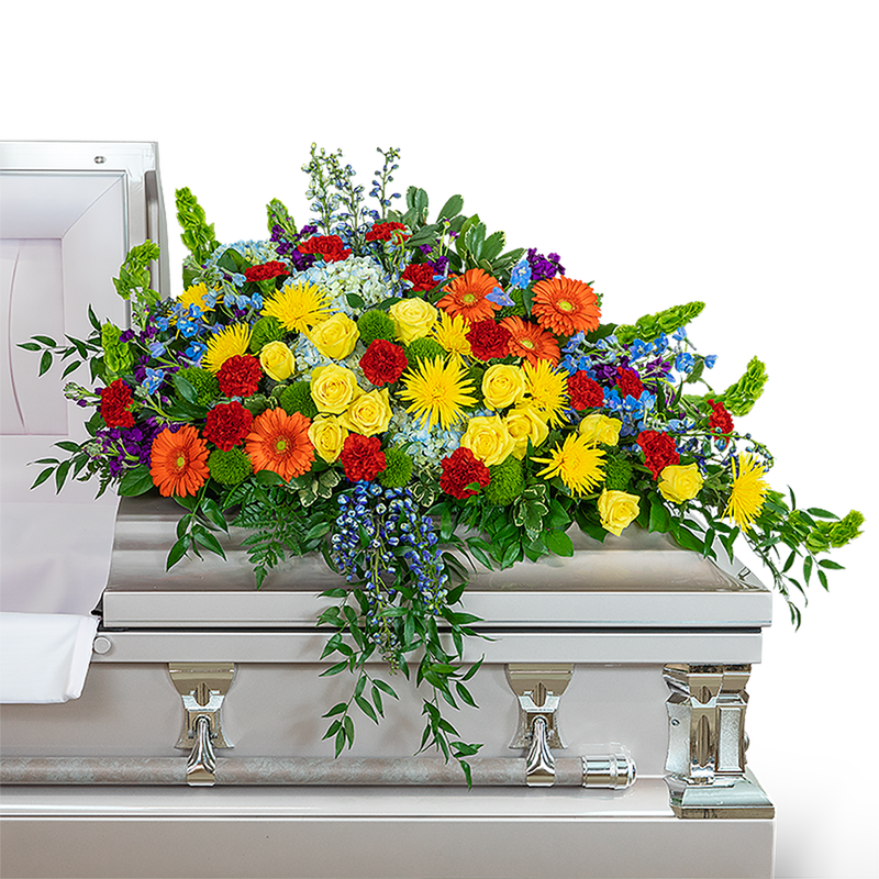 How do you celebrate the life of such an amazing, vibrant person? Our Vibrant Life Casket Spray is a colorful funeral design featuring bright roses, carnations, Gerbera, Hydrangea, Spider Mums, Green Trick Dianthus, Bells of Ireland, Delphinium, Stock, and other premium foliage. The casket flowers are typically provided by the family of the deceased as a heartfelt memorial from the family and are designed to sit on the lid of the casket for a funeral service or memorial.