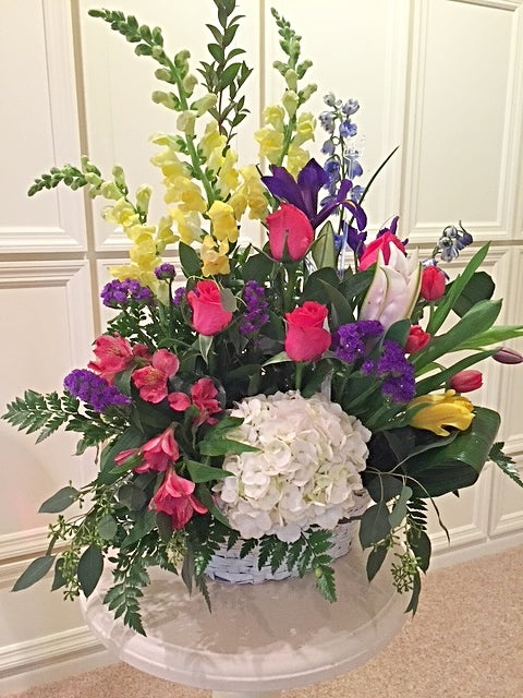 This arrangement features a mix of blooms creating a stunning display. At the base, a white hydrangea serves as a soft foundation, while pink roses add a vibrant touch. Pink alstroemeria adds delicate, star-shaped blooms for contrast, purple statice provides a subtle, textural pop of color. Pink and purple tulips bring a graceful and spring-like feel, while the bright yellow snapdragons and blue delphinium add height and dimension. Seeded eucalyptus brings a natural vibe, complemented by the lush greenery of the leather leaf. This arrangement with beautiful blend of tones is perfect for any occasion requiring elegance and freshness.